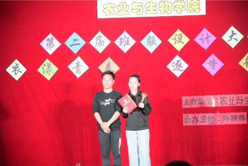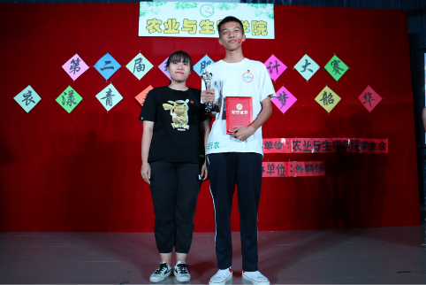 团委学生副书记黄惠娟为生科191颁发二等奖                           团委副书记苏登为种科192颁发一等奖