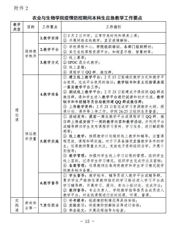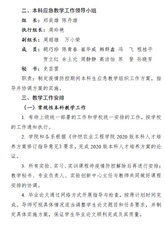 学院成立本科应急教学工作领导小组,书记、院长担任小组组长,教学副院长担任执行组长。形成学院领导决策、组织、指挥,专业负责人切实负责、布置、落实,支部书记、党员先锋、模范、带头,教学秘书、辅导员全力协助、沟通、服务,专业老师认真准备、鼓足干劲的格局。