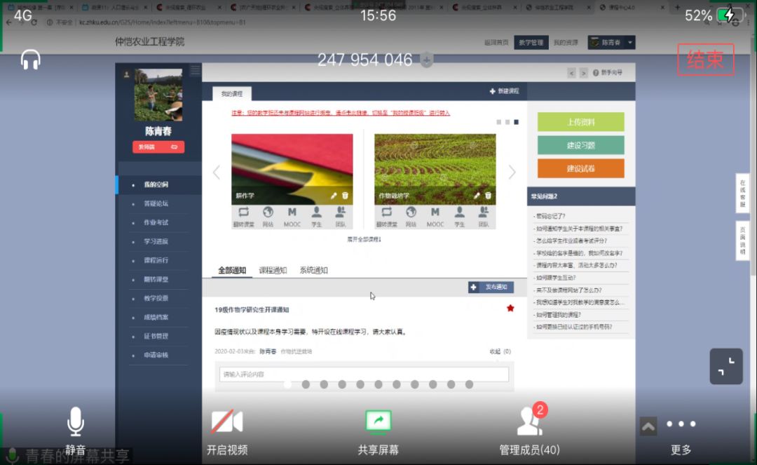 学院、系组织网络教学方法培训会,拓宽和提升教师现代教育教学技术。学院通过会议视频系统举办网络教学方法培训专题讲座。直播培训由农学系主任、省级在线开放课程主持人陈青春副教授主讲,培训会由周玲艳副院长主持,郑奕雄院长出席并做总结讲话。陈青春老师以其主持的省级在线开放课程《作物栽培学》为例,着重讲解了学校课程中心建设与使用方法,解答教师们在建设课程中的疑问,分享网络课程建设相关软件使用。农学系邀请智慧树工程师为老师们进行培训网课、微课的录制。通过培训,老师们在学校课程中心建课20多门。