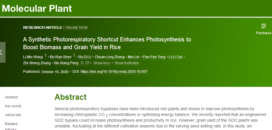 2020年10月16日,m88 app教师王丽敏博士在Molecular Plant(IF2019=12.084)上发表题为“A Synthetic Photorespiratory Shortcut Enhances Photosynthesis to Boost Biomass and Grain Yield in Rice”的研究论文(https://www.cell.com/molecular-plant/fulltext/S1674-2052(20)30353-1)。该研究利用优化后的叶绿体信号肽(RC2)将水稻乙醇酸氧化酶(OsGLO1)、大肠杆菌过氧化氢酶(EcCAT)、乙醛酸聚醛酶(EcGCL)和羟基丙二酸半醛还原酶(EcTSR)四个酶导入水稻并定位到叶绿体中,使光呼吸产生的部分乙醇酸直接在叶绿体内代谢释放CO2,形成了类似C4植物的CO2浓缩机制。该途径的碳计量与植物光呼吸途径完全一致,因此亦可称为光呼吸捷径(以下简称GCGT捷径)。此捷径的引入显著提高了水稻的光合效率、生物量和产量。