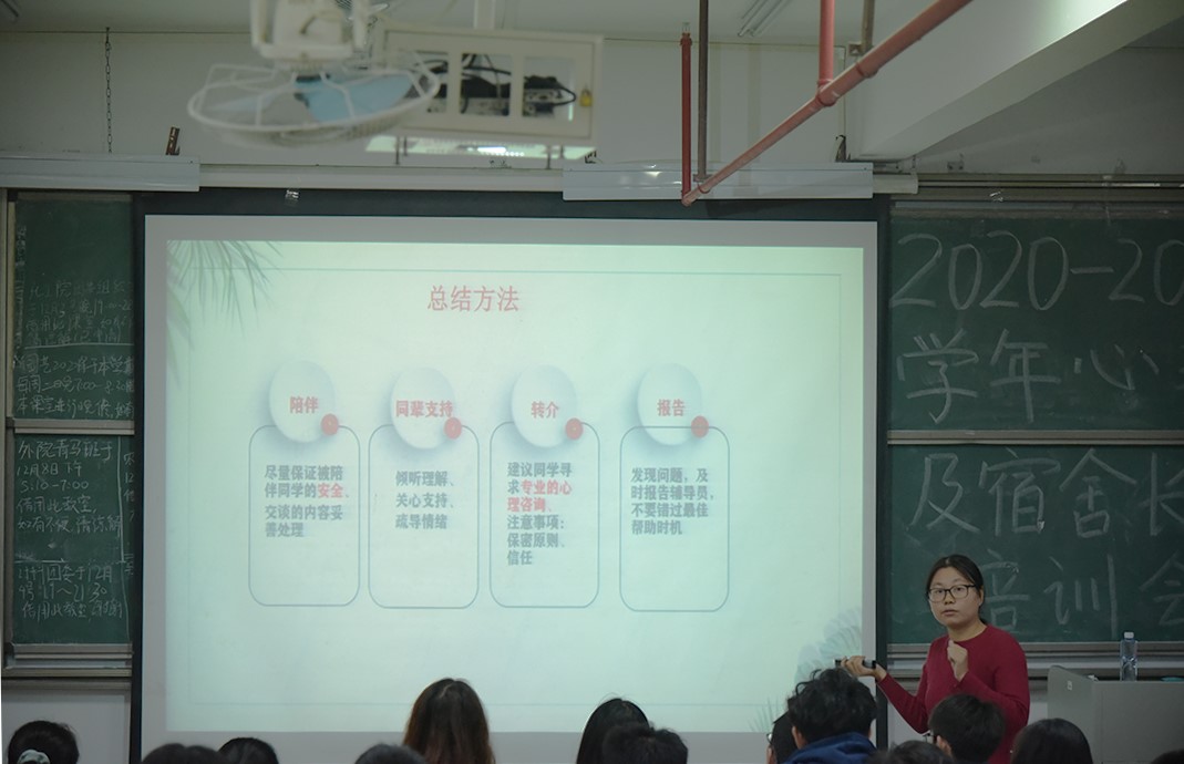 随后,她向大家介绍了一般性心理问题及处理策略,并介绍了常见的非精神病性心理疾病和精神病性心理疾病的识别方法,如抑郁症、躁狂症、精神分裂症等。最后,她向大家讲解了应如何帮助有心理疾病的同学,强调遇到同学有心理疾病应及时告知辅导员或学校心理中心,由学校专业人员来帮助同学解决问题。
