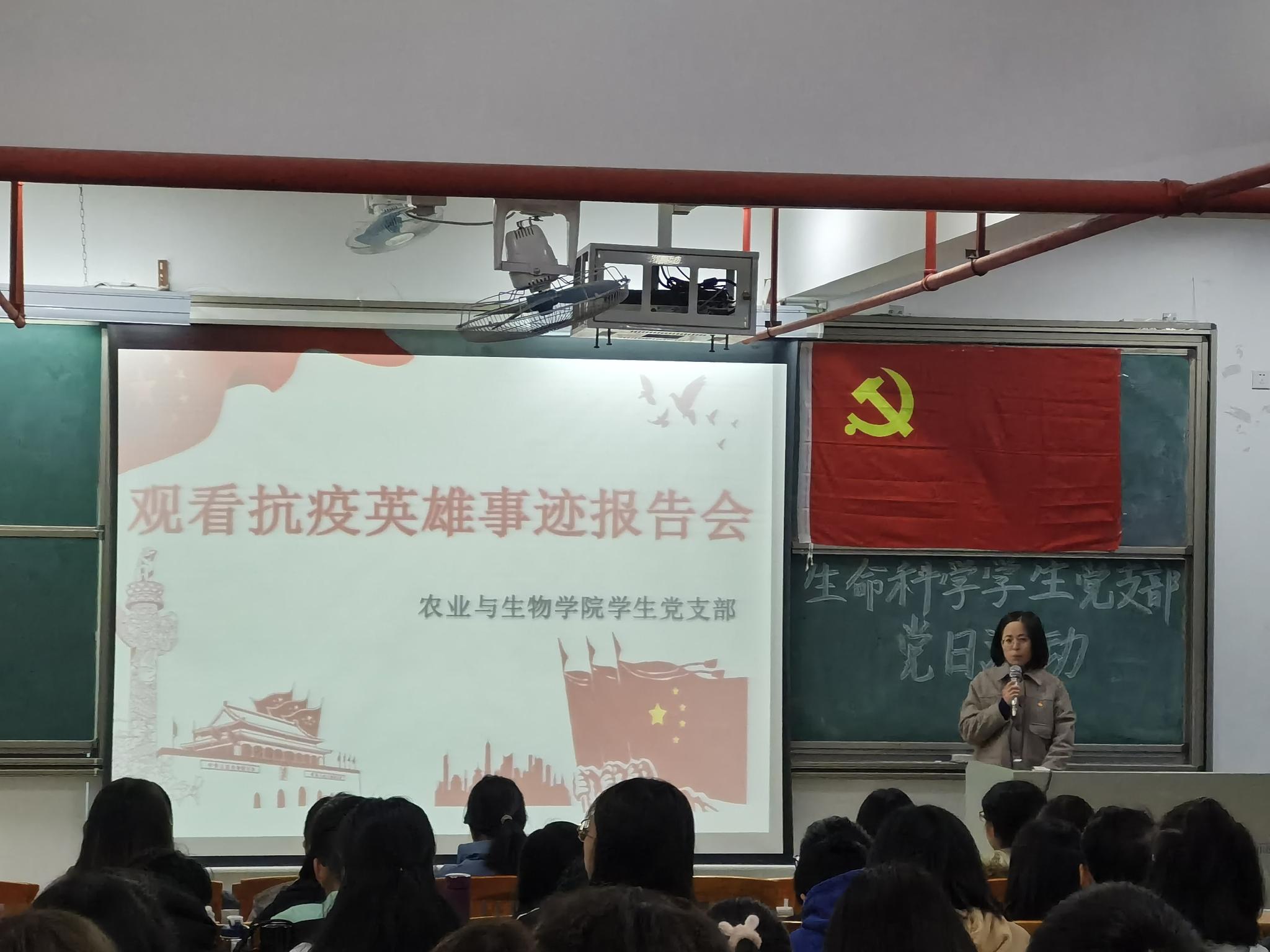 为深入学习贯彻习近平总书记在全国抗击新冠肺炎疫情表彰大会上的重要讲话精神,大力弘扬伟大抗疫精神,广泛宣传抗疫斗争中做出重大贡献的功勋模范人物先进事迹和高贵品质,学习抗疫英雄舍生忘死、顽强拼搏的精神,12月20日晚,m88 app学生党支部在综合楼D607、D707组织学生党员及入党积极分子集体观看抗疫英雄报告会《英雄的人民 人民的英雄》。植物保护学生党支部书记高结怡和生命科学学生党支部书记孙晓芳分别在D607、D707课室与同学们一起聆听报告会。