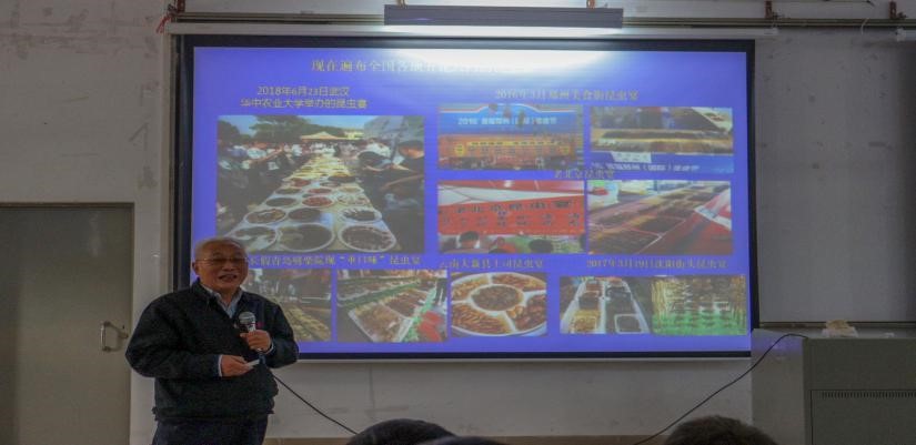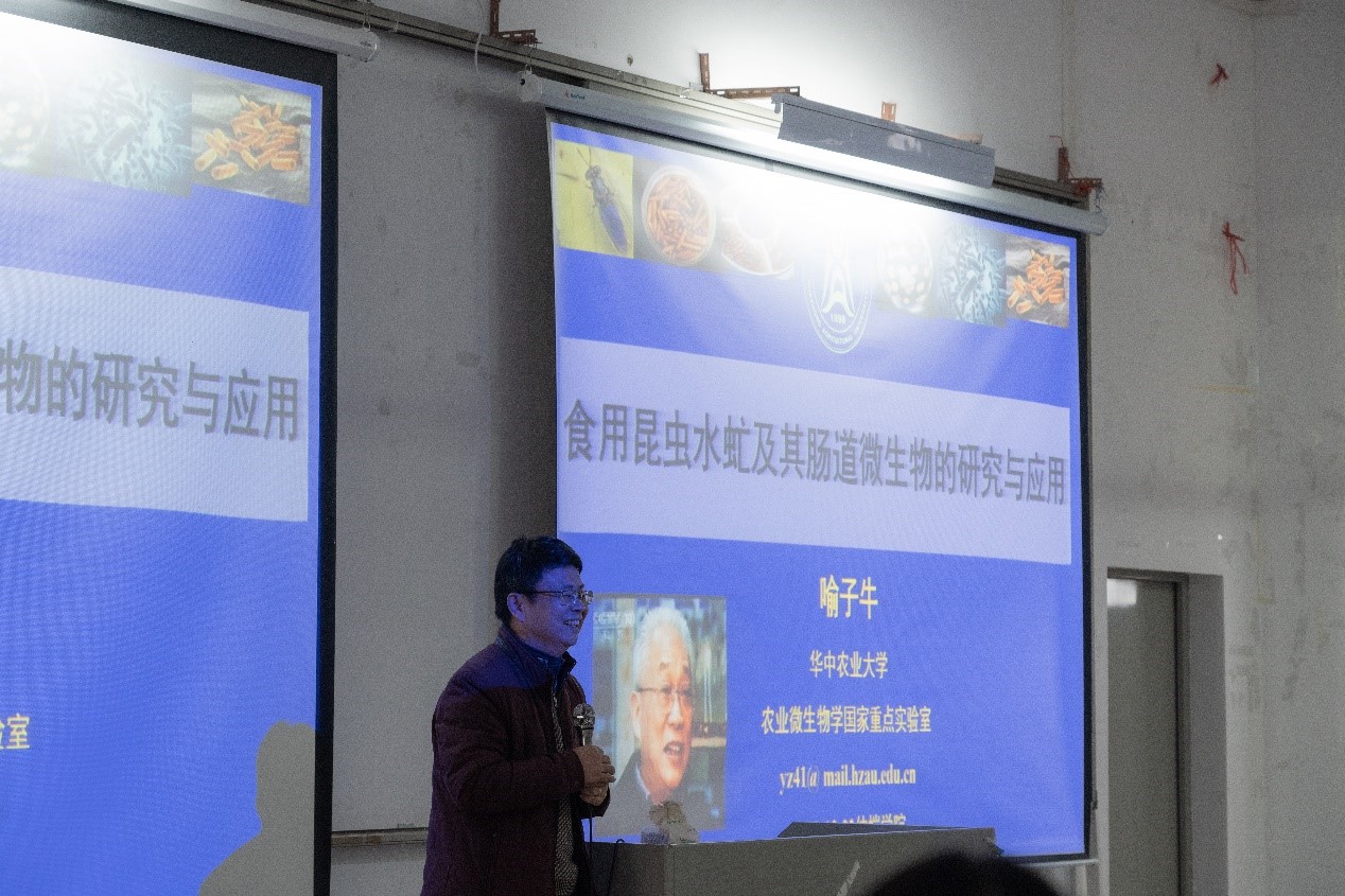 讲座上,喻子牛教授首先以“食用昆虫的古今中外”为切入点,向大家展示了遍布世界各地五花八门的昆虫宴,指出食用昆虫可以作为医药治疗疾病。同时,他借助世界各地的相关会议向大家阐述了“未来昆虫养育世界”“昆虫是上帝留给人类的最后一块蛋糕”等观点。他强调,由于昆虫整体生物量超过陆地上所有动物的总生物量且具有世代短暂、繁殖迅速、转化率高的特点,所以人类应该合理运用昆虫资源。