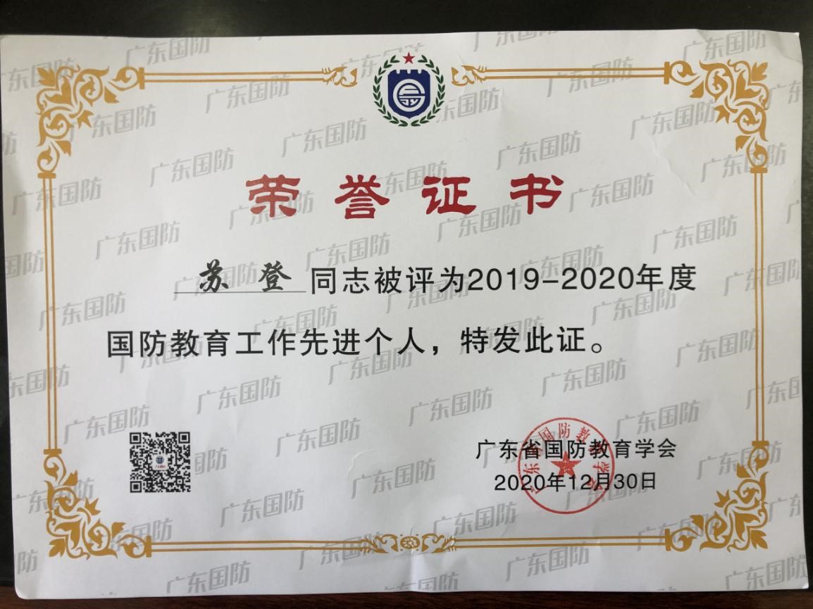 2020年广东省国防教育工作会议于12月29日至31日在潮州召开。会议对2020年全省国防教育工作成绩突出的集体和个人予以表彰并进行颁奖。经各单位、各高校推荐,经广东省国防教育学会评定,m88 app苏登老师获得“广东省国防教育工作先进个人”荣誉称号。