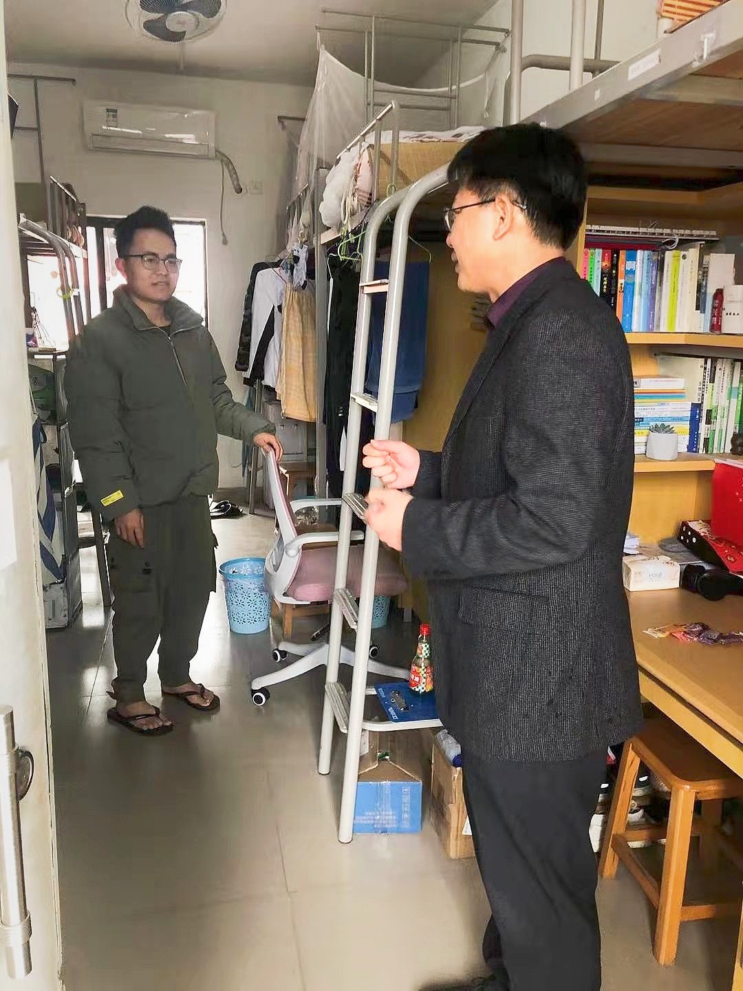 3月3日,m88 app党总支书记陈丹雄、党总支副书记周超雄与辅导员苏登、李城、肖芳芳一行探望m88 app返校学生。