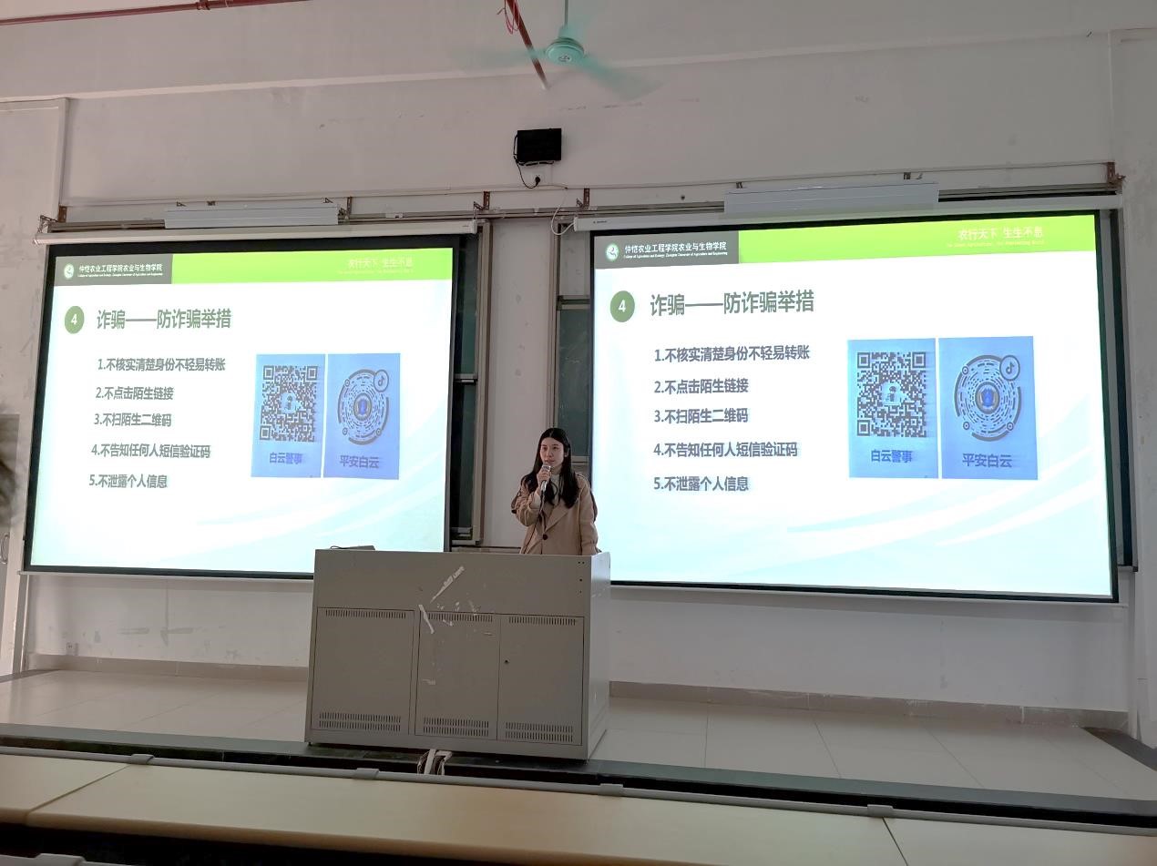 会上,肖芳芳老师重点强调了两个问题。第一,安全问题。由于刚刚开学,大学校园中诈骗案件频发,诈骗类型繁多。肖芳芳老师通过一些近期发生的真实案例,向同学们分析了诈骗常用的手段和类型,并提醒大家要提高防范意识和防诈骗能力,不轻信陌生来电,保护好自己的人身安全和财产安全。