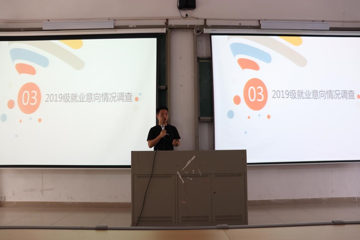 本次会议主要分为2020年就业形势分析、m88 app2020届毕业生就业情况以及2019级就业意向情况调查等三个板块。会议伊始,苏登通过近10年高校毕业生人数逐年增长的数据,让同学们了解当前就业形势的严峻,并且就m88 app2020届毕业生的就业情况向同学们进行了分析。他指出,在2020届毕业生中,成功考研的有88人,占比22.11%。同时他鼓励大家,如有考研意向,要尽早规划,提前准备。紧接着,苏登结合同学们填写的职业规划问卷进行了相关分析,并针对大家近期的困惑一一给与了回应。最后他强调了做好个人职业生涯规划的重要性,只有提前规划自我,才能成就未来。