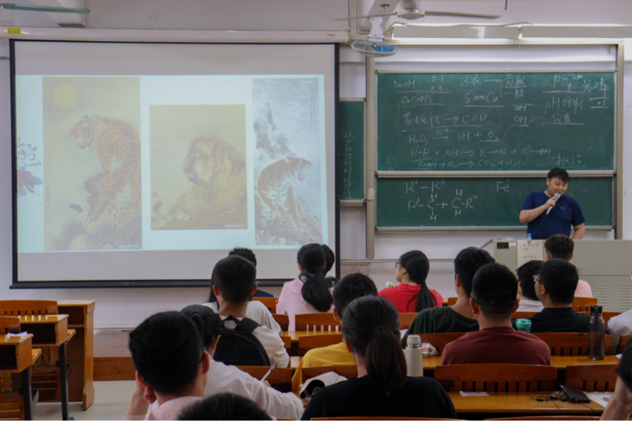 会上,李城向同学们介绍了何香凝先生传奇的一生,她的一生就犹如她笔下的画遒劲有力、气度恢弘。或许正是因为如此,她才能把狮虎勾勒出祖国的模样。乱世之中,何香凝与廖仲恺先生相依为命,携手并进,坚决支持“联俄、联共、扶助农工”的三大政策。为救丈夫,她孤身入虎穴;痛失所爱后,她带着自己与丈夫廖仲恺先生的志向继续与反革命派作斗争。1927年,何香凝先生回到广州创办“仲恺农工学校”,践行“扶助农工”的志向。1937年全面抗战爆发后,近花甲之年的何香凝先生爱国之志老而弥坚,对救亡运动热情支持,并始终不忘将妇女解放与抗日救亡运动紧密结合起来。