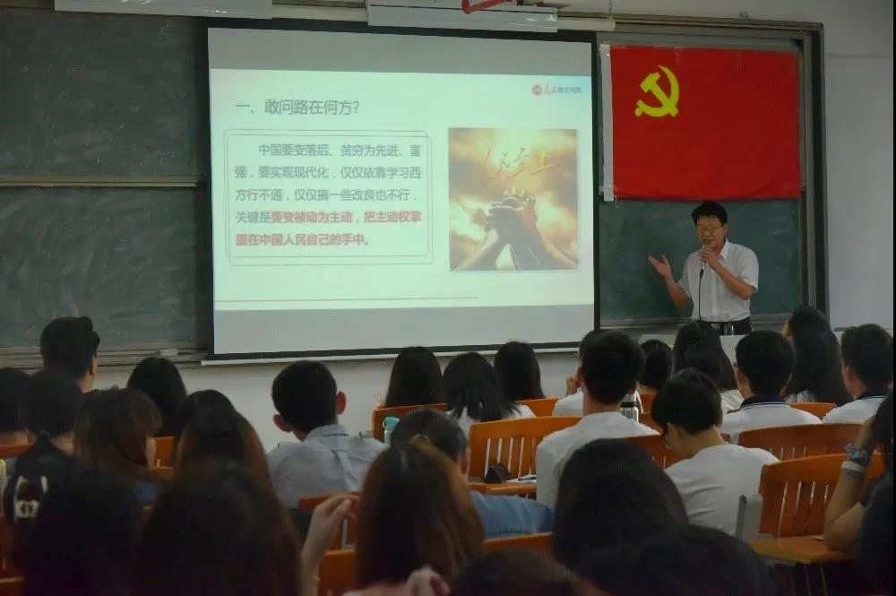 接下来,围绕“中国共产党为实现中国现代化的百年奋斗历程”这个主题,陈丹雄书记从三个方面展开详细讲述。首先,提出疑问,敢问的路在何方?陈丹雄书记向同学们表明,路其实就在我们脚下。接着从两个方面回答了我们要走什么样的路。一是不走“老路”和“邪路”,不走封闭僵化的“老路”,不走改旗易帜的“邪路”;二是不照抄照搬苏联的旧路,立足中国国情,走具有中国特色的“新路”。