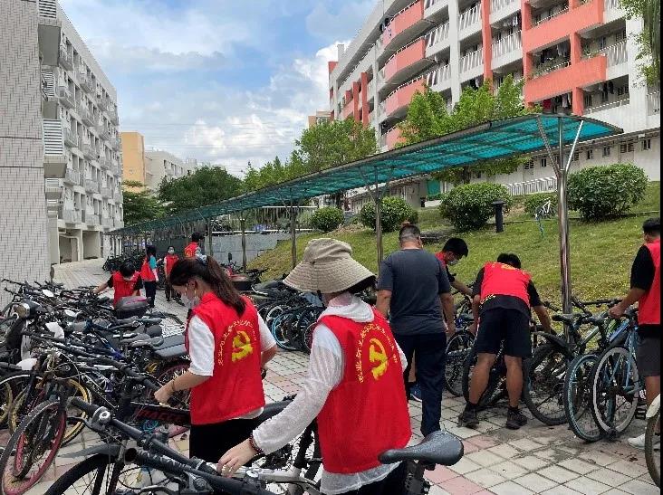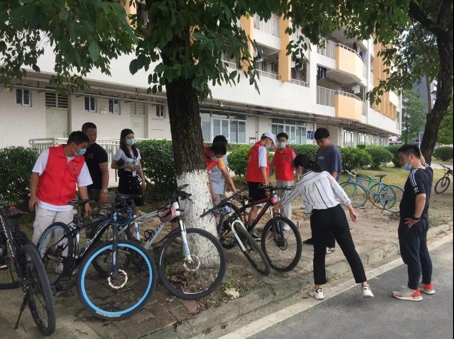 志愿者们以10人为一组跟随保卫处工作人员前往整理点。面对锈迹斑斑、身着厚重灰尘的自行车,志愿者们并无胆怯,默默清理。他们将废弃自行车依次搬运到指定位置,红色身影如同星星之火,志愿者们用自己行动点亮仲恺河畔。