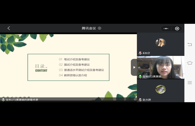 在会议中,黄惠娟分别从笔试、面试、普通话水平测试和教师资格认定等四个方面为同学们介绍了教师资格证的考试流程并提出了自己的备考建议。她还详细解答了同学们提出的问题,解开了同学们的一些关于考试的疑惑。