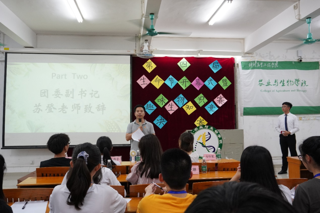 首先举行的是第四届生命节开幕式。仪式上,学生骨干代表王柄森带大家回顾了往届生命节的精彩现场,随后他介绍了本届生命节的主要活动:趣味生物知识竞赛、种子画大赛和健康素养知识竞赛。最后,由团委副书记苏登老师致辞,首先他对参赛了到来的同学们表示了欢迎,他希望各班级的同学能积极参加学院举办的类似活动,本次活动主题为“探索生命、感悟生命、绽放生命”,生命节的举办是对同学们专业知识的一次考验,其中涉及到很多的专业知识和生物知识,他希望同学们能认真学习并通过努力取得良好的成绩。