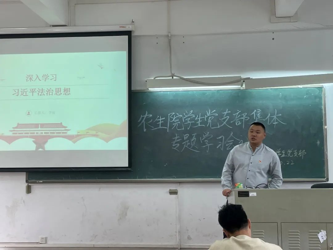 为深入学习习近平法治思想,推进全面依法治国,也为进一步提高学生党员的法治意识,2021年10月22日中午,m88 app各学生党支部在杨钊杨勋楼402召开习近平法治思想专题学习会议,学生党支部书记孙晓芳、苏登、李城出席了会议,全体学生党员参加了本次会议。此次学习会由植物保护学生党支部代理书记李城主讲。