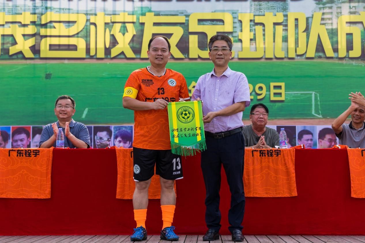 (周超雄为本次巡回赛校友足球队队长黄洪校友授队旗)