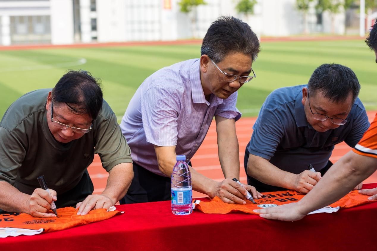开赛前,王子明致辞。他热烈欢迎参加本次足球巡回赛的各地校友,勉励大家多运动、多联系、多交流,常怀仲园情谊。王子明师兄幽默风趣的讲话引起了校友们的强烈共鸣,现场报以热烈掌声。接着,周超雄为本次巡回赛校友足球队队长黄洪校友授队旗,殷切叮嘱校友们赛出风格、赛出仲园精神,并带领校友们一起为印有“仲恺校友足球巡回赛(茂名站)”标志的比赛球衣签名留念。球衣签名仪式结束后,仲恺校友会茂名联络处秘书长丁怡明宣布仲恺茂名校友会足球队正式成立,并代表茂名地区校友足球队向各地校友足球队发出邀请,诚邀各地校友常到茂名来参观、联谊和比赛。