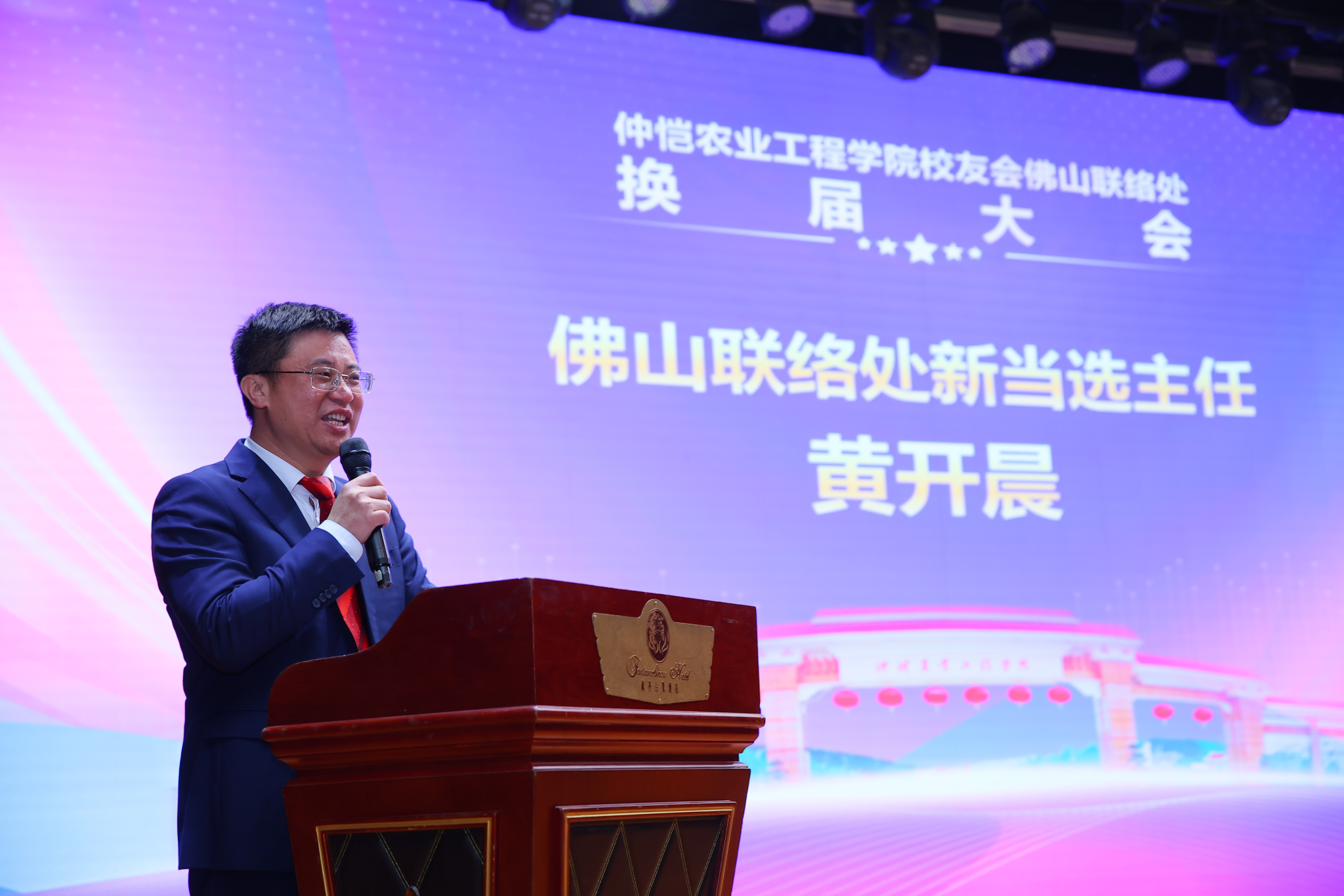 校友会佛山联络处新任职主任黄开晨校友作表态发言。他对校友会佛山联络处第一届理事会成员打下的坚实基础表示感谢,与校友们重温了佛山联络处的四大鲜明特色,表示将继续发扬仲恺精神,传承佛山联络处的优良作风,以建立更紧密的联系、提升更高的影响力、作出更大的贡献为目标,当好母校的宣传员、校友的联络员和校友资源的推广员,继往开来,为打造“标杆”式的校友联络处不断努力。