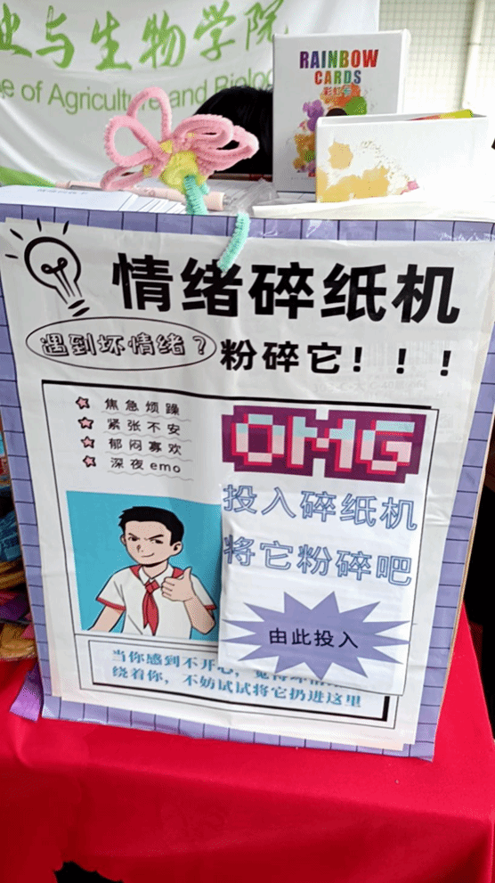 m88 app在活动摊位上设置了琳琅满目、新颖有趣的心理小游戏,包括情绪粉碎机、心理知识问答、猜猜我是谁、企鹅敲冰大作战等。尽管当天下着小雨,也仍然没有浇灭同学们前来体验游玩的热情,其中最受欢迎的当属“情绪粉碎机”。同学们将自己平日遇到的不良情绪写在情绪回收卡上,放进情绪粉碎机进行粉碎,并可以领取一张充满正能量的美文书签,以激励人心、温暖励志的文字力量给自己加油打气。除此之外,摊位现场还挂满了与心理健康相关的书籍和电影介绍,如《心理医师》、《心灵捕手》、《蛤蟆先生去看心理医生》、《乌合之众》、《社会心理学》等,吸引了不少同学驻足浏览。通过丰富多样的心理小游戏和心理知识宣传,同学们不仅在轻松愉快的气氛下加深了对心理健康的认识,也提高了情绪的自我调节能力。