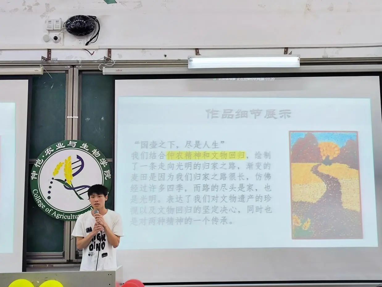 比赛正式开始后,进入决赛的20支队伍轮流上台对作品进行介绍。各队伍成员结合自己的种子画作品,将队伍的创作理念与精神、创作所用的种子一一向大家介绍。别出心裁的作品构思、色彩鲜艳的画面、灵活巧妙的种子选取、细致深刻的讲解让每一副作品都给评委与观众留下了深刻的印象。