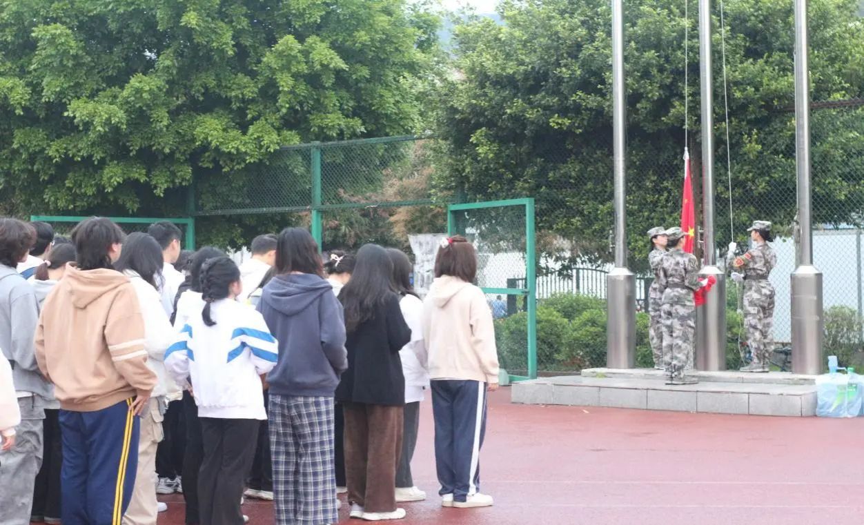 随着黄金辉宣布升旗仪式正式开始,国旗护卫队成员高举旗帜,伴随着雄壮的国歌声,五星红旗缓缓升起,全场师生齐声高唱国歌,行注目礼,共同表达对祖国的无限崇敬。