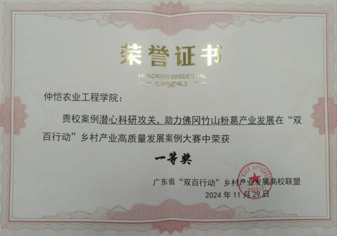 11月29日,广东省农业技创新联盟与广东省“双百行动”乡村产业发展高校联盟2024年度科技成果交流暨家禽产业大会在m88 app白云校区召开。在本次大会中,m88 app“潜心科研攻关,助力佛冈竹山粉葛产业发展”在“双百行动”乡村产业高质量发展案例大赛中荣获一等奖。