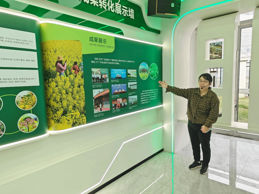 在国家油菜工程技术中心南方分中心南方油菜多功能利用分中心的展厅,孙伟老师首先向大家讲解了国家食用油战略和国家油菜工程技术中心南方分中心南方油菜多功能利用分中心的建设,研究院的建设目标、人才支撑和成果展示等。张姿丽老师详细讲解了油菜杂交育种的基本过程,南方油菜的发展前景,阐述了菜用、饲用、绿肥、花用、蜜用等油菜多功能利用的模式。展厅中带领大家参观了数十个优良的油菜新品种的种子、菜籽油、油菜花蜜、油菜花粉、油菜酒、压片糖等油菜特色产品。