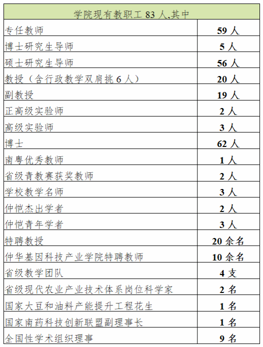 人才培养特色鲜明 开门开放办学,注重协同育人 学院与新西兰林肯大学、华中农业大学、广东省农业科学院、广东省科学院、深圳华大基因研究院、广东凯普生物科技股份有限公司等国内外高等院校、科研院所和知名企业建立了较为稳定的交流与合作关系,为推动师生对外交流合作奠定了良好的基础。